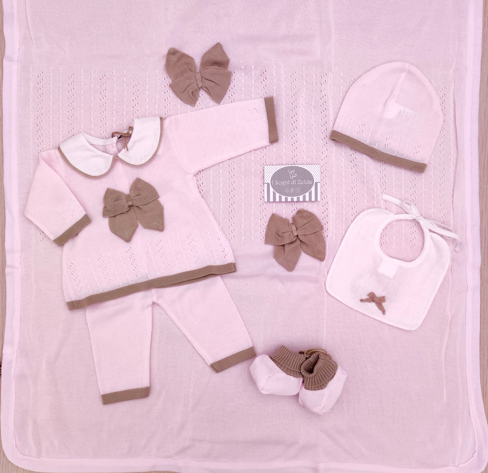 Corredino nascita Rosa Fiocco Tortora – Bebèmargò, comprende coperta doppiata, completino due pezzi, scarpette, cappellino, bavetta. 1 mese – 56cm – 100% cotone – Made in Italy Cod: B031