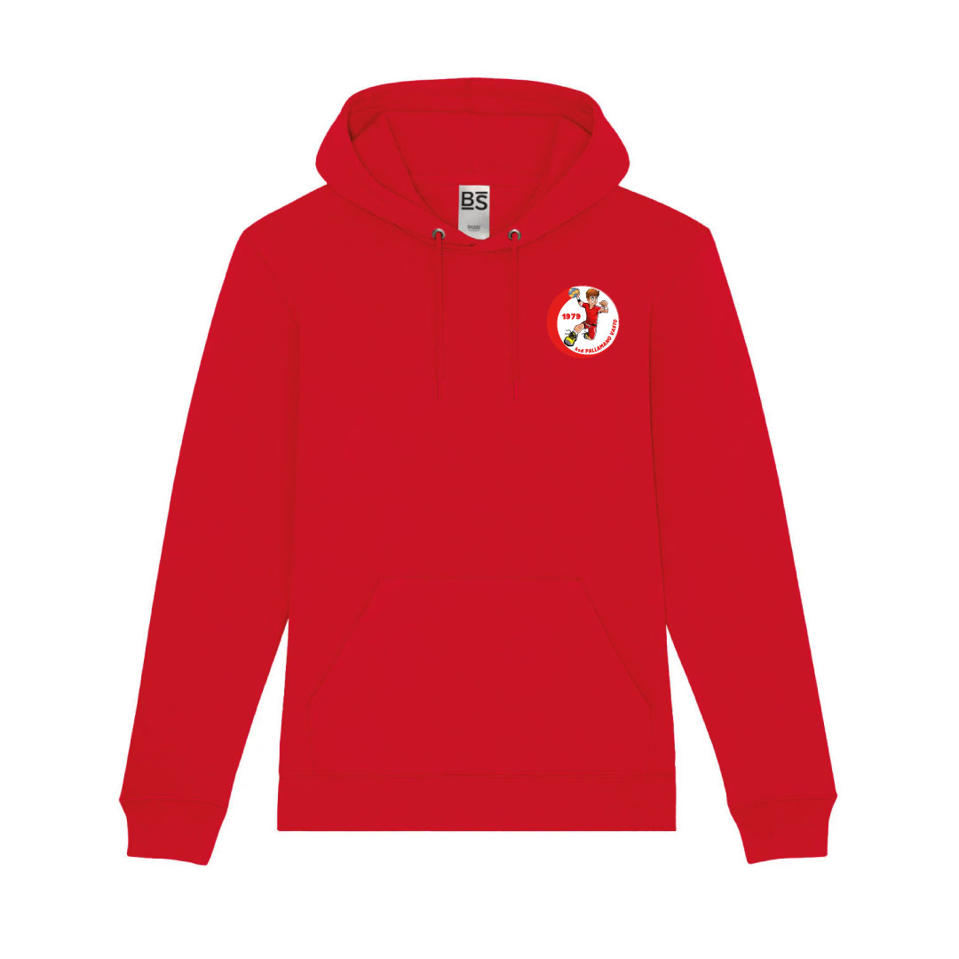 Felpa con cappuccio in cotone organico e poliestere riciclato. Felpata internamente. Stampa fronte/retro. Colore: Rosso
