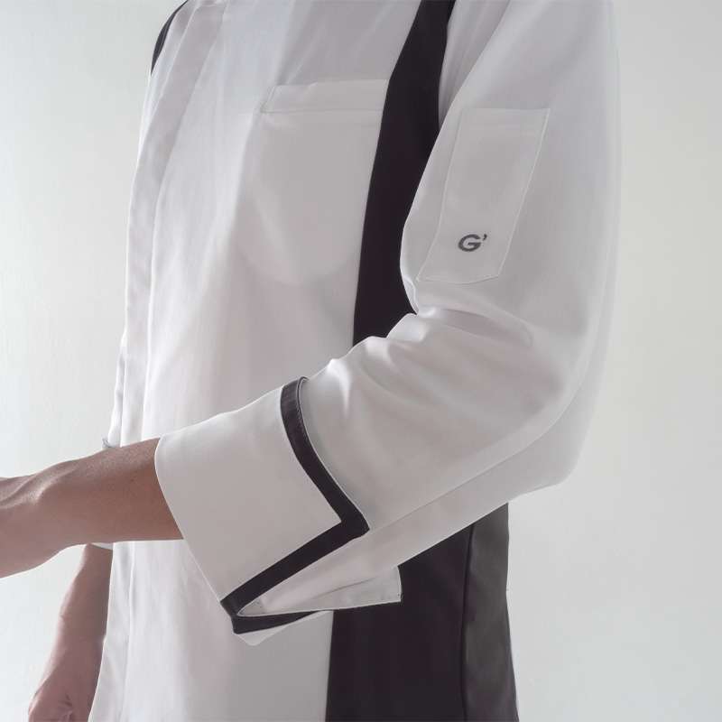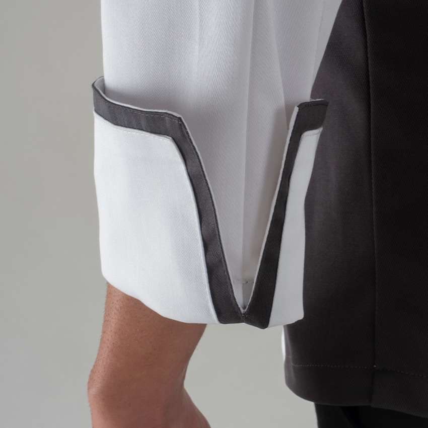 Il collo ed i polsi sono caratterizzati da elementi a contrasto per esaltare la geometria del capo,