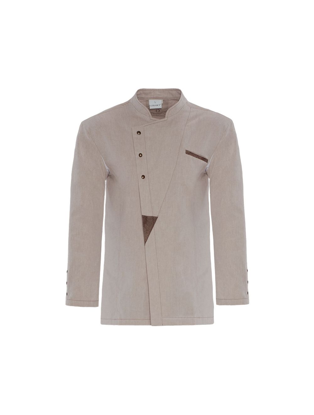 Lo stile e il taglio moderno della giacca Grosseto, nella nuova versione beige con applicazioni in pelle, รจ rafforzato dal motivo dei 3 bottoni a pressione in ottone anticato sul davanti e sul fondo delle maniche.