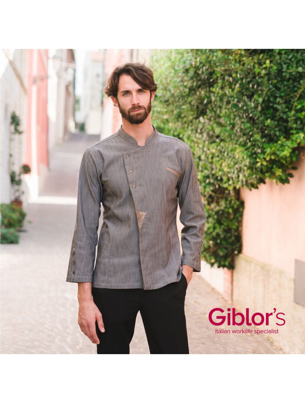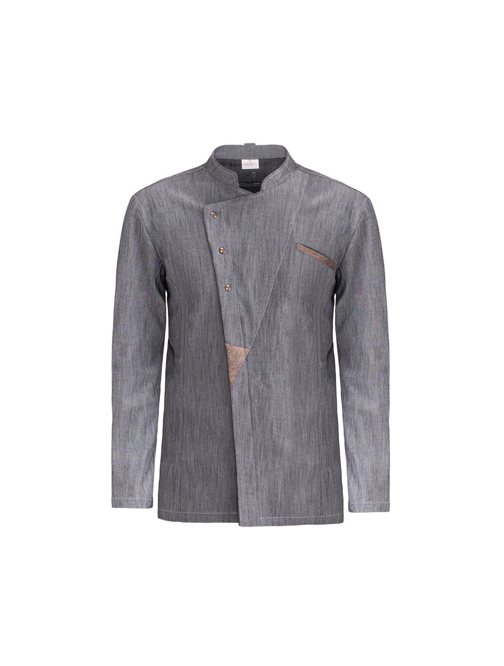 Lo stile e il taglio moderno della giacca Grosseto, nella nuova versione black denim con applicazioni in pelle, รจ rafforzato dal motivo dei 3 bottoni a pressione in ottone anticato sul davanti e sul fondo delle maniche. Un nuovo polso รจ stato pensato per permettere un facile arrotolamento della manica. Il comfort รจ affidato alla composizione del tessuto con la componete stretch ed agli spacchi sul retro, che garantiscono ampia libertร di movimento e unโeccellente vestibilitร . Il portapenne sulla manica sinistra รจ confezionato con impunture grigie con un filato 30 a contrasto. Nel retro lโasola per lโinserimento del laccio del grembiule รจ caratterizzata dallโetichetta tessuta Giblor’s, ed รจ ancorata da un automatico in tinta.