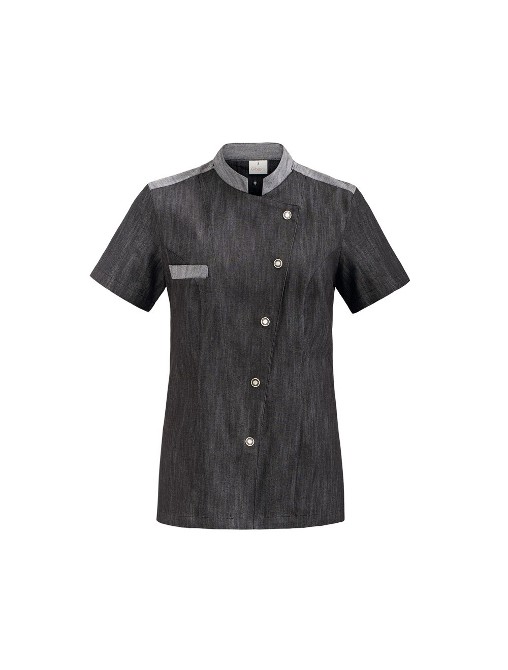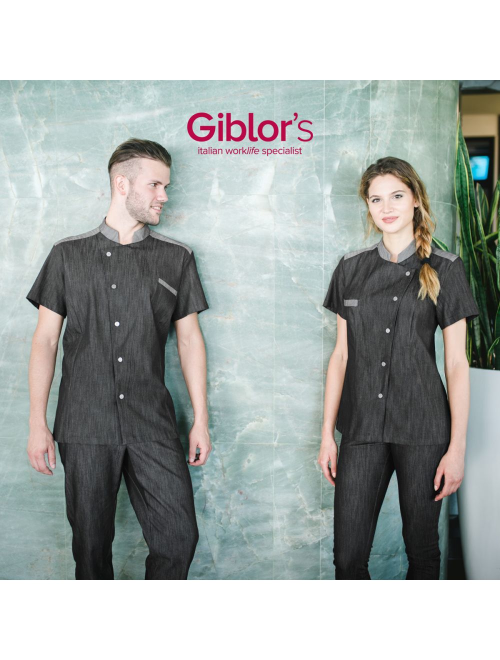 Le giacche Achille e Kassandra, rispettivamente maschile femminile, sono capi trasversali: realizzati in tessuto jeans 210 grammi elasticizzato, dalla mano morbidissima, resistente alle alte temperature, assemblato giocando con il rovescio dello stesso, hanno un aspetto decisamente moderno. Presentano il collo coreano a squadra, la parte posteriore realizzata interamente in rete traspirante, e due spacchi che si accordano ai due tagli sagomati nel retro. Lโasola per lโinserimento del laccio del grembiule, con il rinforzo a contrasto, viene ancorata dal logo โGโ. I cinque automatici posti sul davanti con uno style di cerchi concentrici sono stati realizzati con una galvanica zapponata in nichel opaco, che conferisce luce e valorizza lo stile.