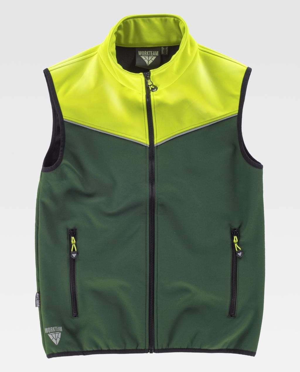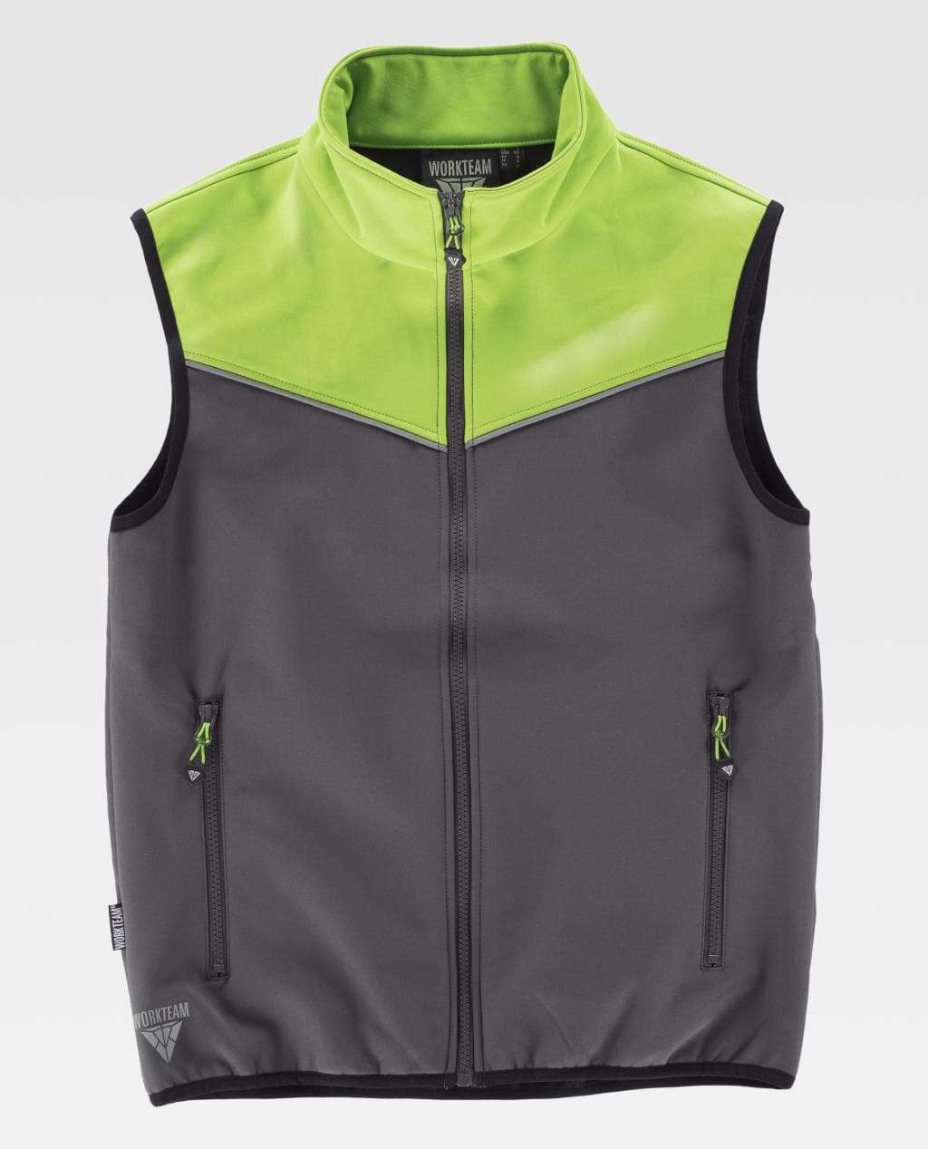 Gilet Workshell Con bordino sul petto riflettente Collo alto e chiusura di cerniera. Due tasche laterali con cerniera. Una tasca interna con chiusura cerniera Filetato di sbieco a contrasto bicolore Tessuto antivento, Idrorepellente all’acqua e resistente allo strappo, Interno Termico Materiale: 96% POLIESTERE + 4% ELASTANE Peso: 330 gr/m2