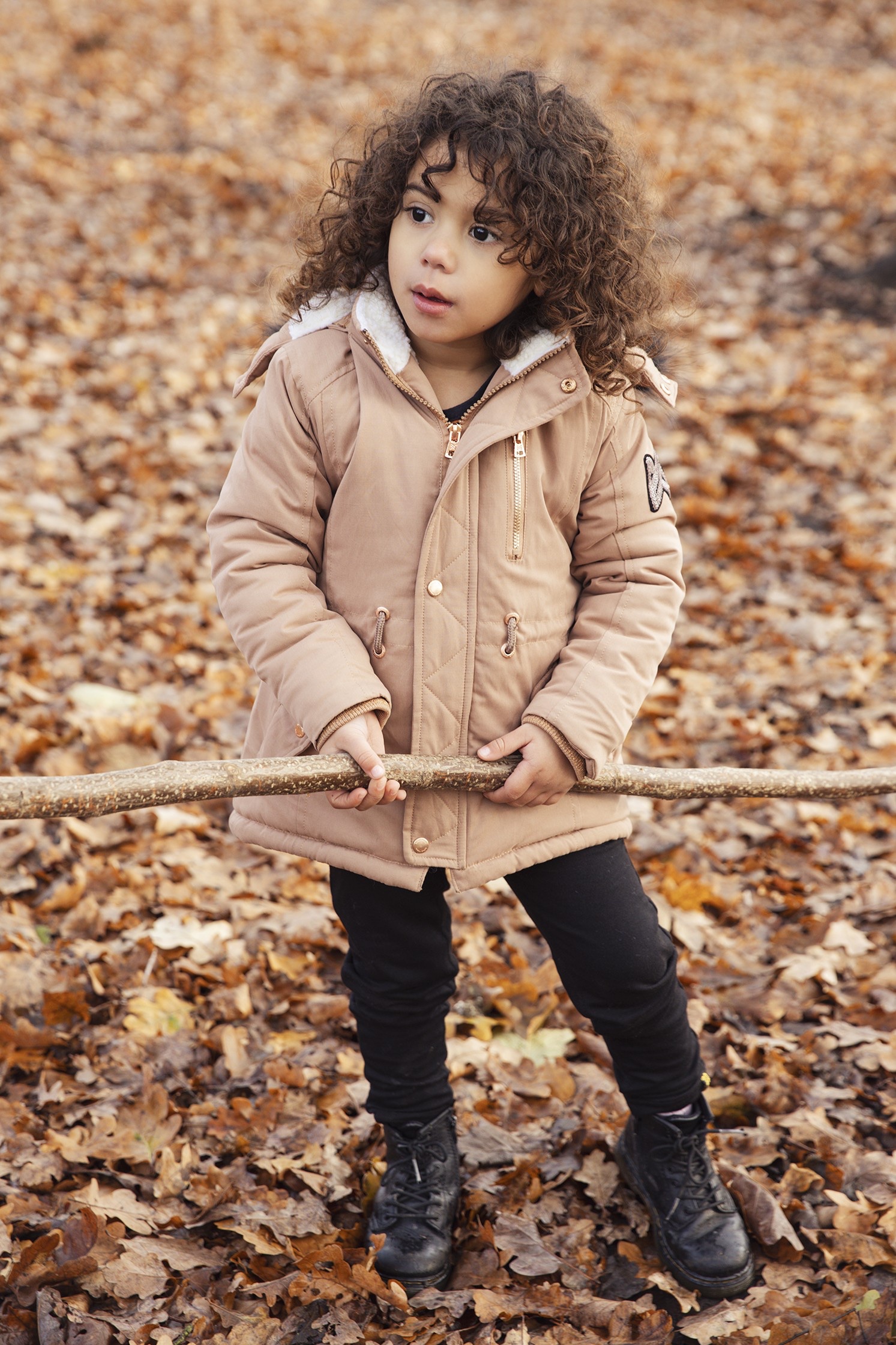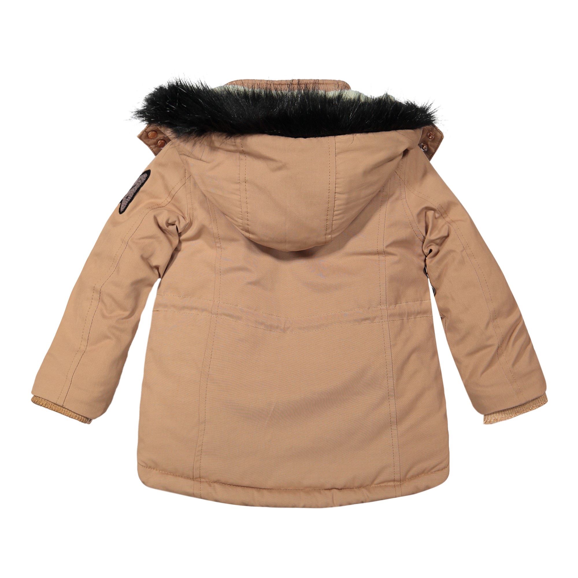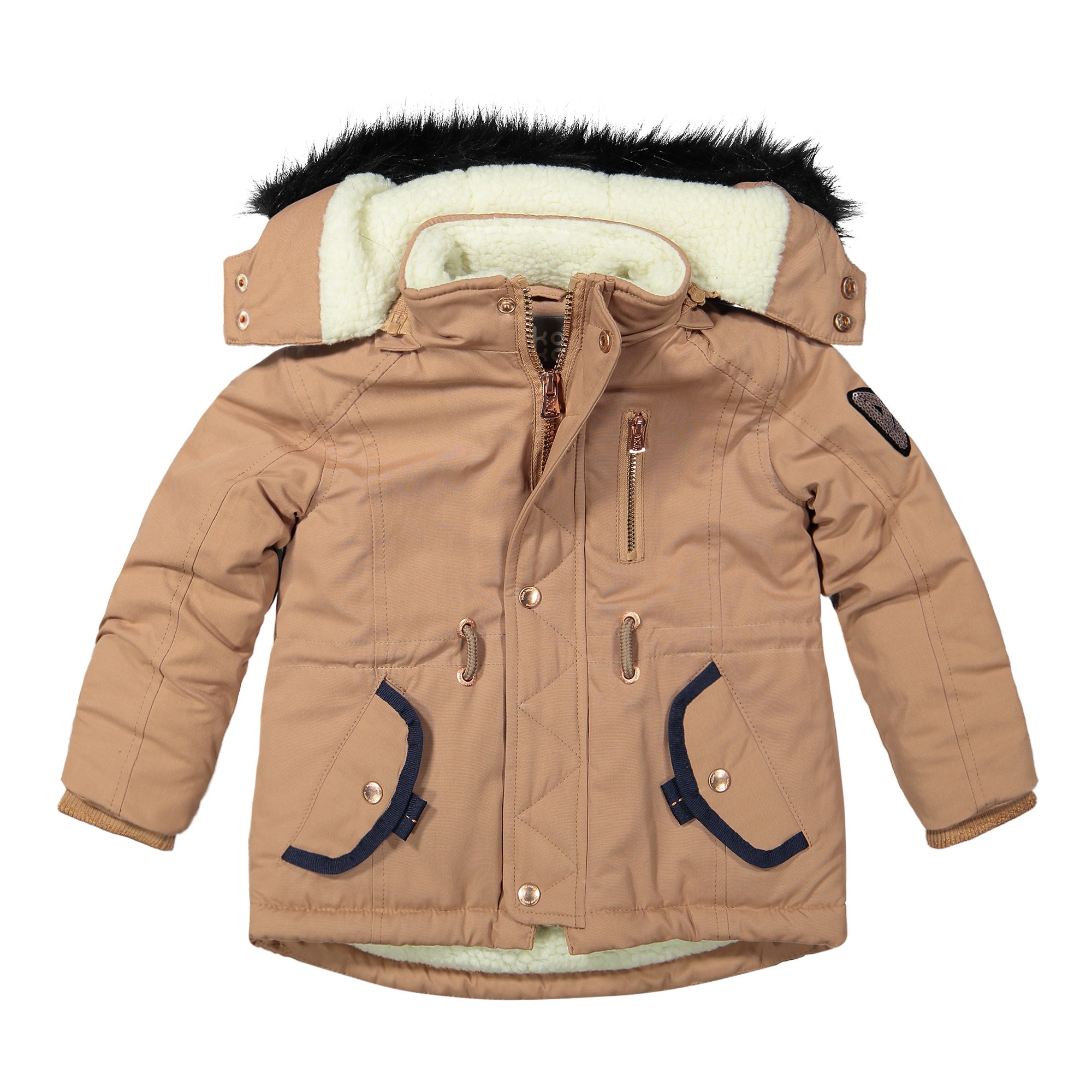 Giubbino bambina color Cammello con punti di riflessi oro rosa sulle cerniere e bottoni.