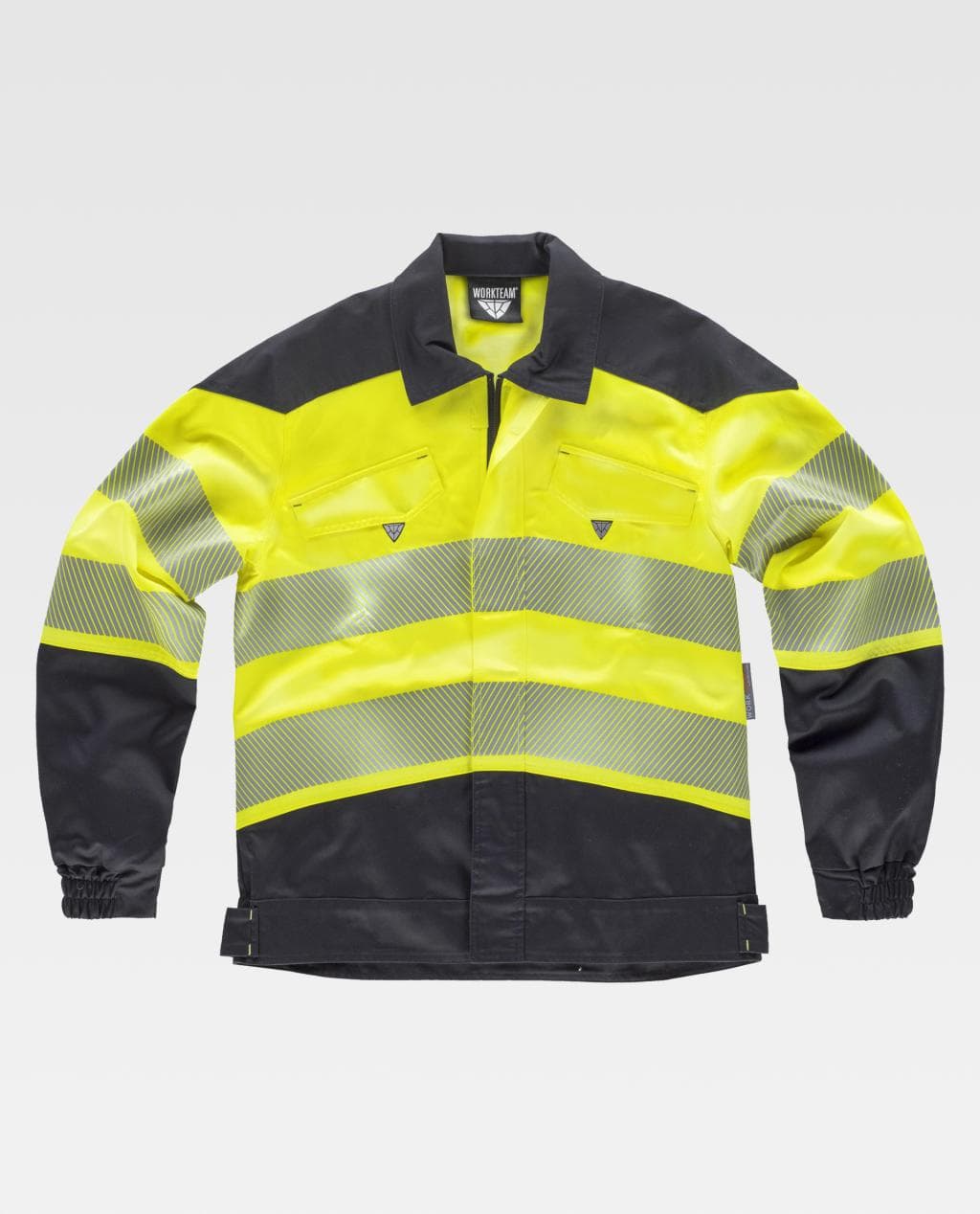 Due bande riflettente segmentate termoadesive sul petto, schiena e maniche.