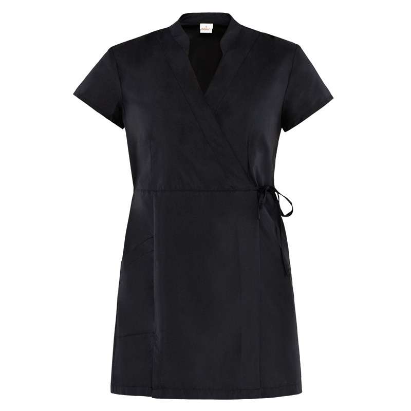 Colletto alla coreana, incrocio con lacci da annodare in vita, manica corta e spacchi per facilitare il movimento.