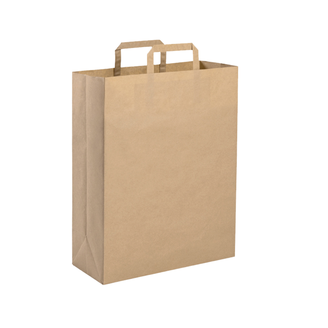 Shoppers in carta kraft avana con manico piatto. Stampa digitale. La stampa verrร effettuata su un solo lato.
