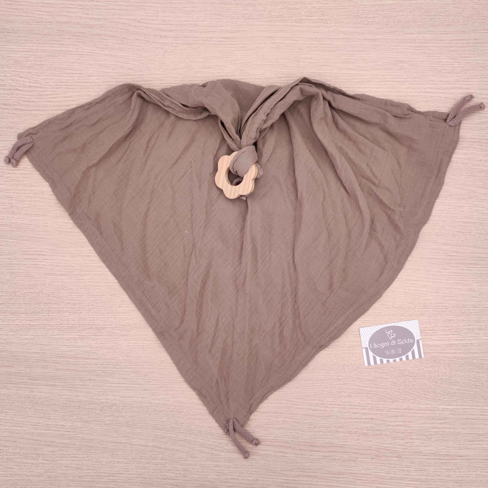 Mussola Doudou con dentaruolo in Legno – Wedoble – Tortora 55×55 cm – 100% cotone – Made in Portugal