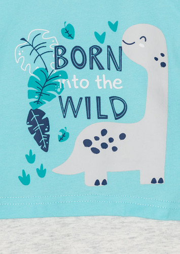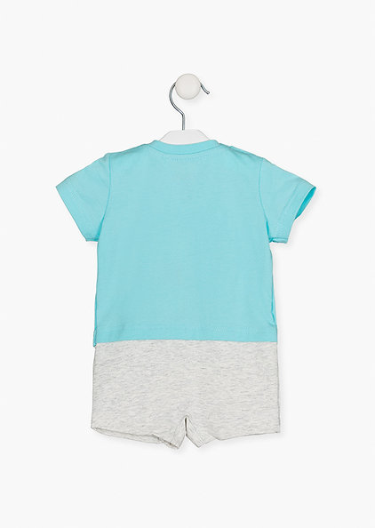 Pagliaccetto in cotone, con finta t-shirt e pantaloncino. Stampa dinosauri