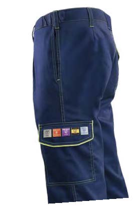 Tessuto: twill doppio strato 98%, cotone/2% fibra antistatica, peso 495 gr/mq