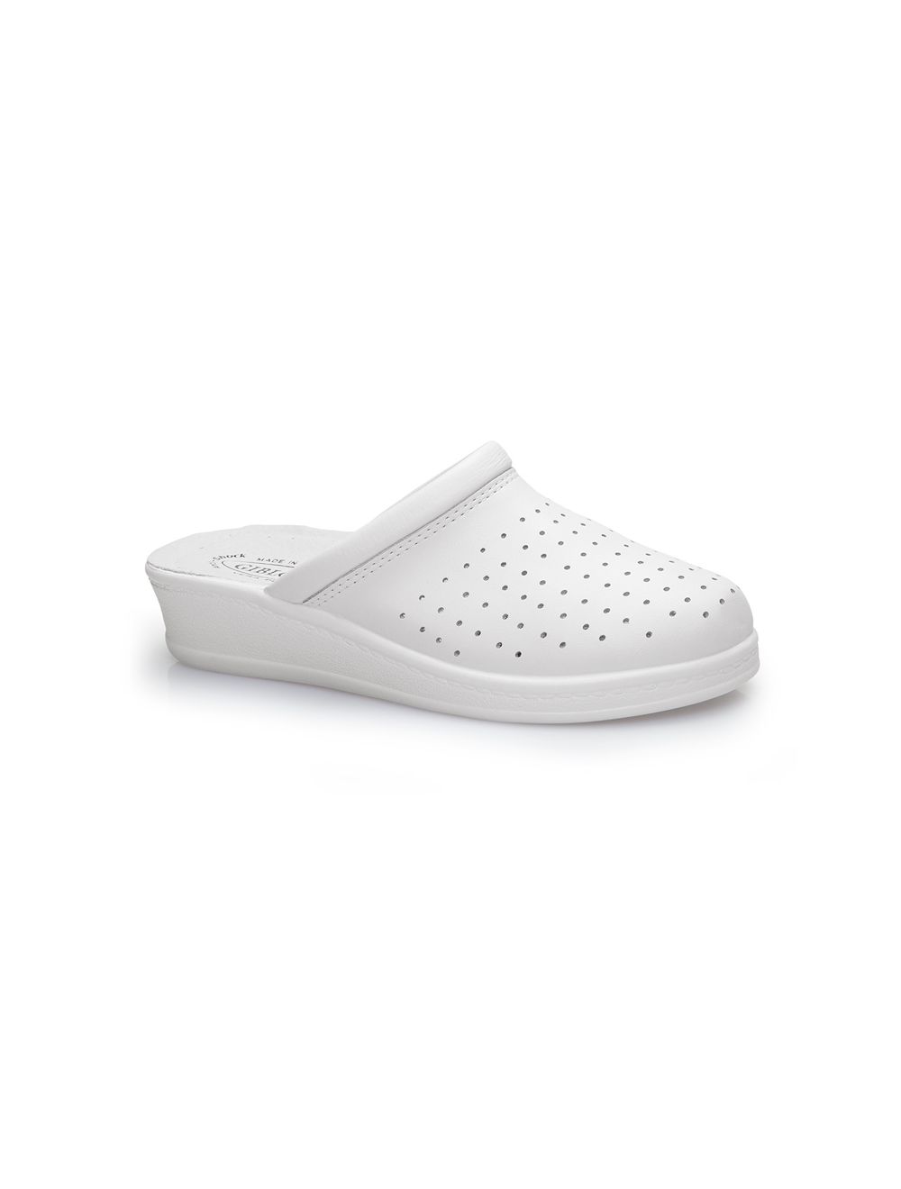 Pantofola Sanitaria Bianca Zoccolo in pelle traforato Imbottitura sul collo del piede Montato su una punta tonda dritta. Sottopiede anatomico Antiscivolo