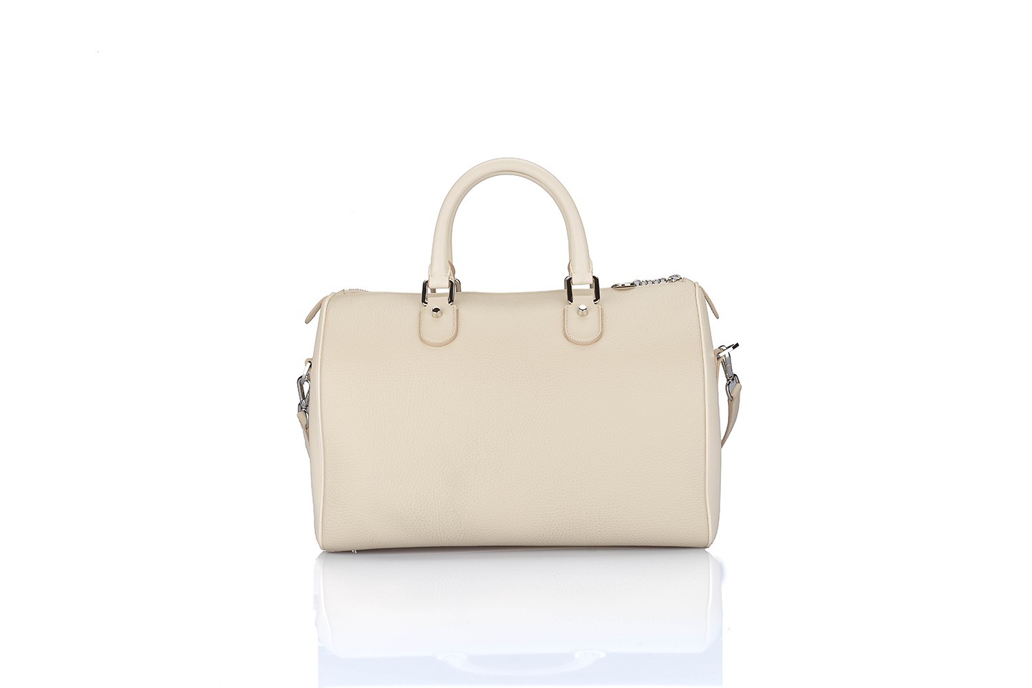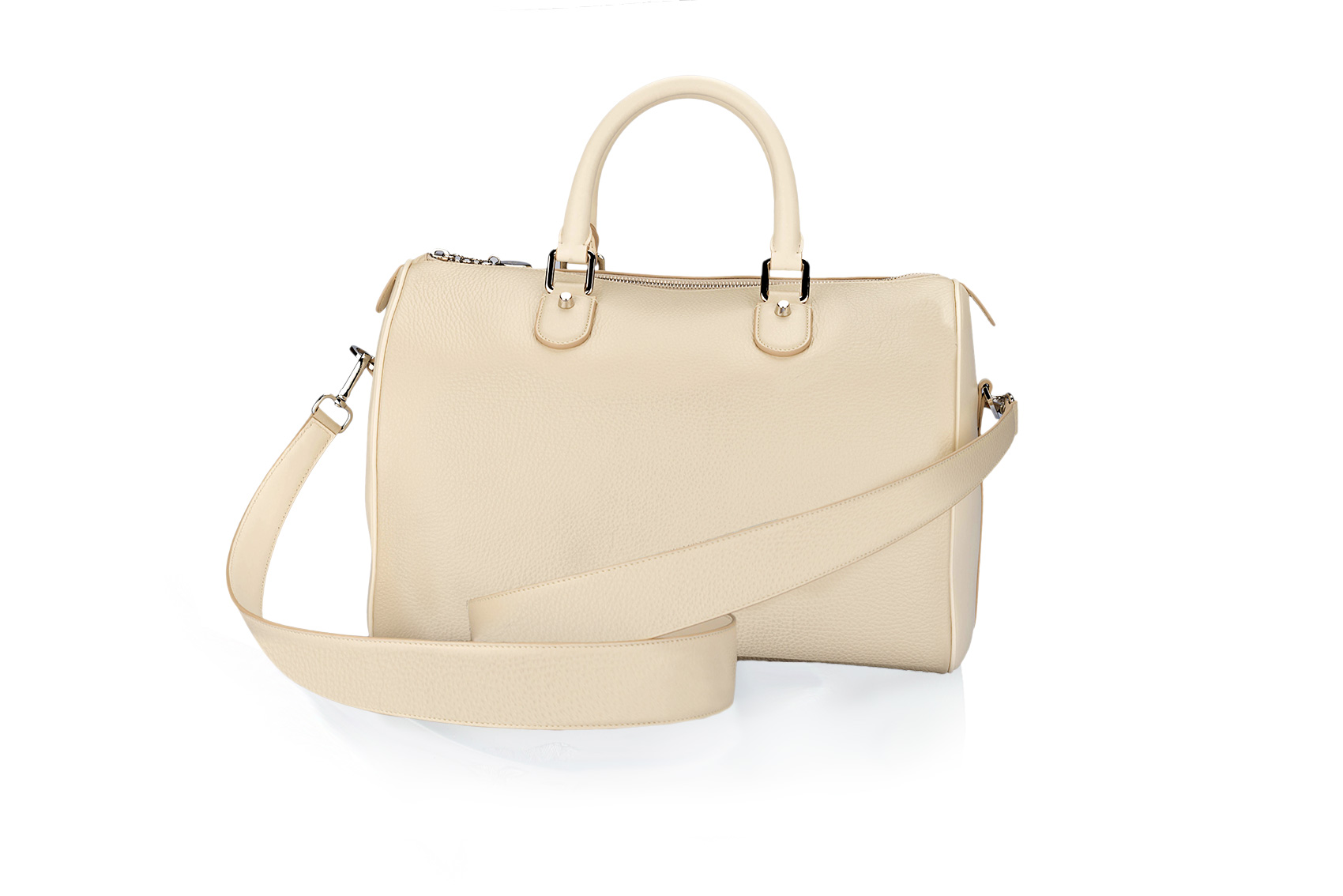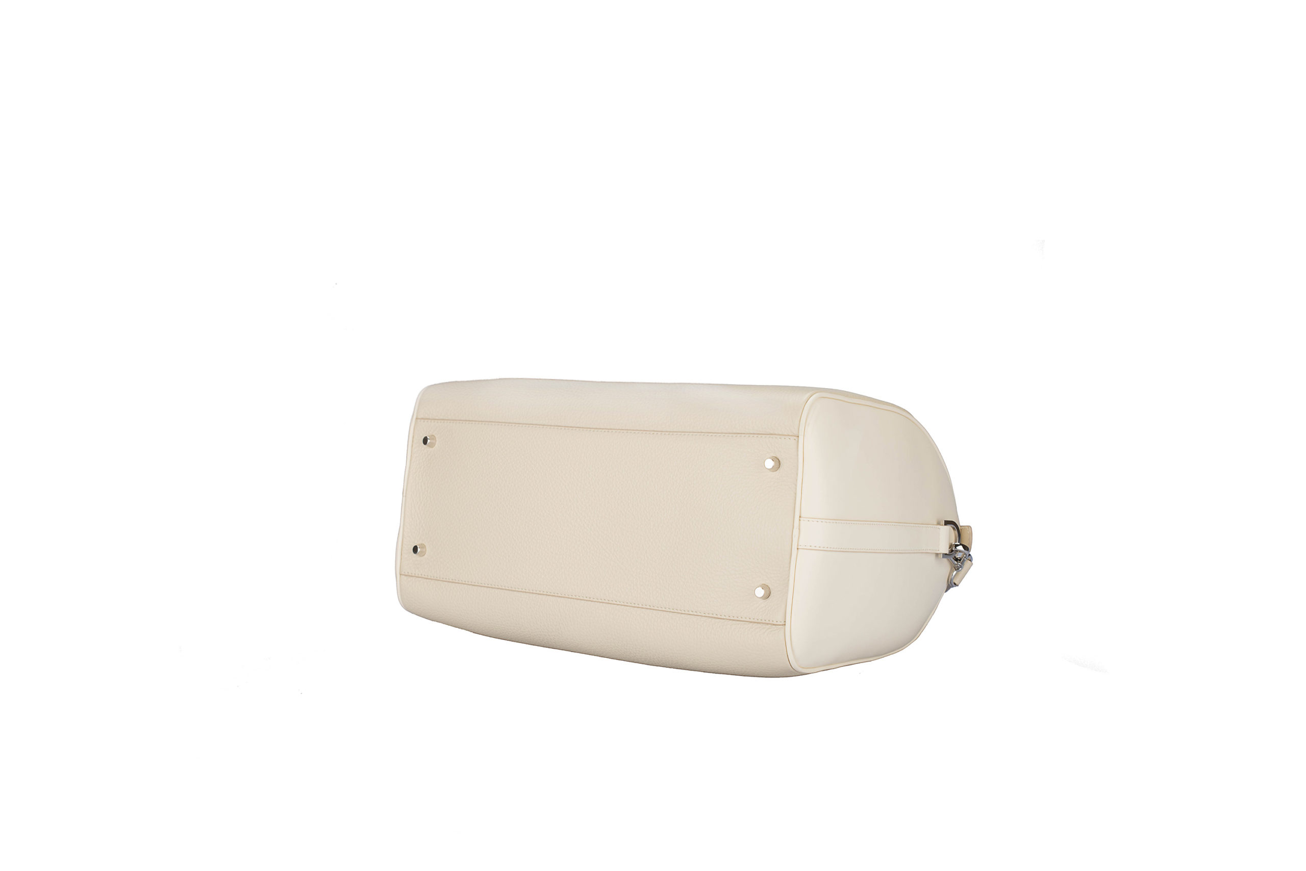 Due manici lunghezza 12 cm. Tracolla in pelle removibile, lunghezza 120 cm. Metalleria color argento. Logo Coccoluto Ferrigni in metallo sul davanti.