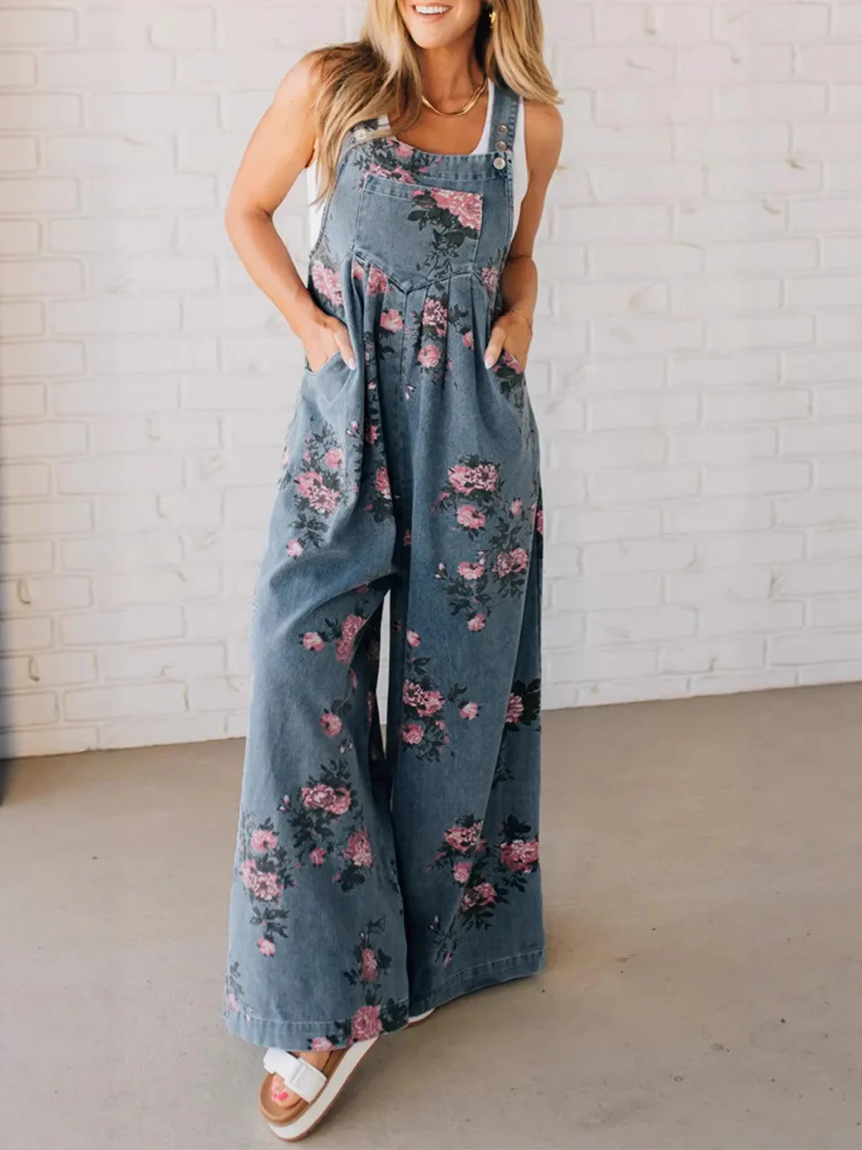 Salopette Donna Larga – Denim Floreale con Tasche e Comfort Giada