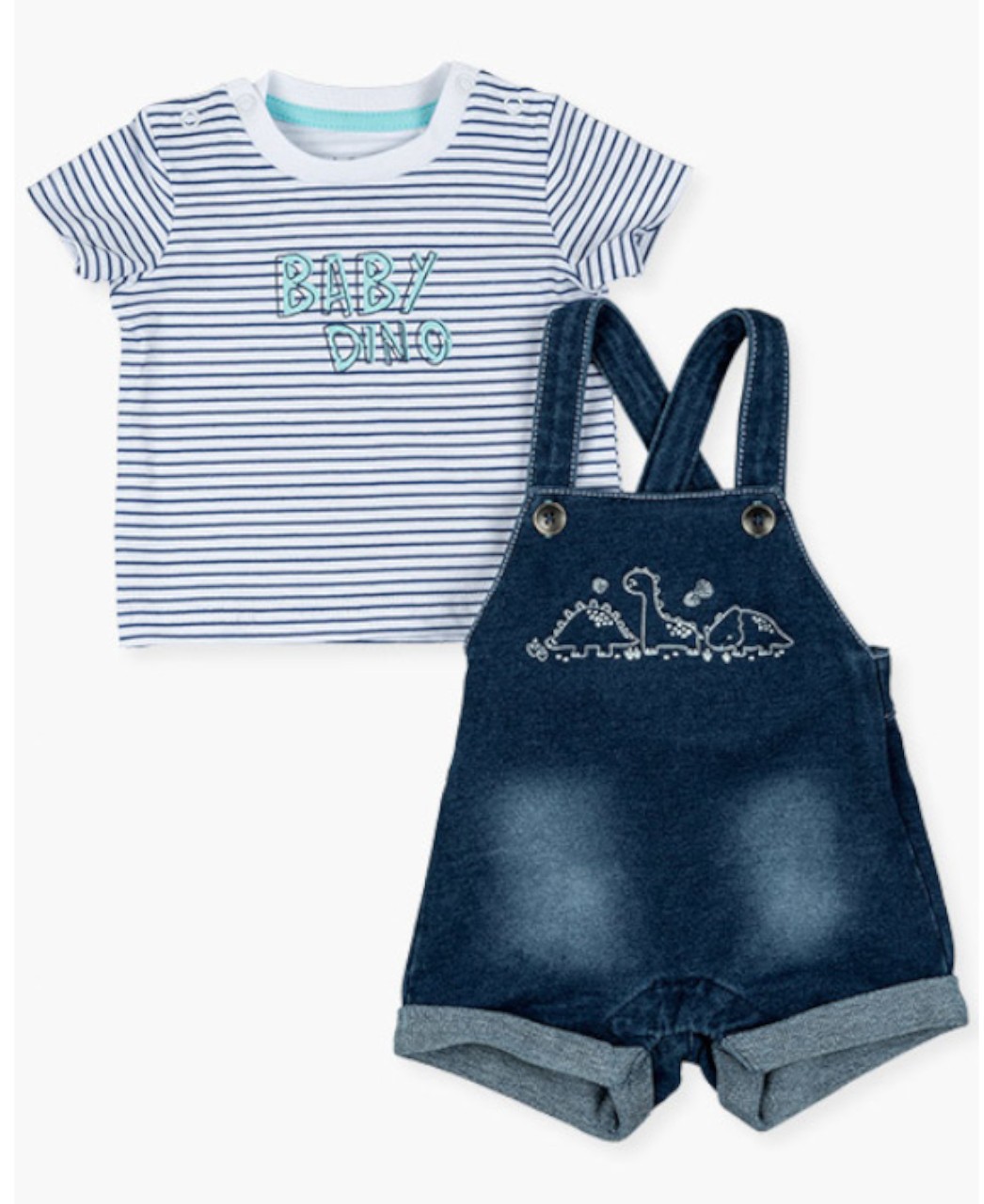 Completino per neonato Losan, composto da salopette in jeans con bottoni alle bretelle, stampa dinosauri sul davanti e risvolti, maglietta in cotone jersey a mezze maniche, fantasia a righe con stampa sul davanti.