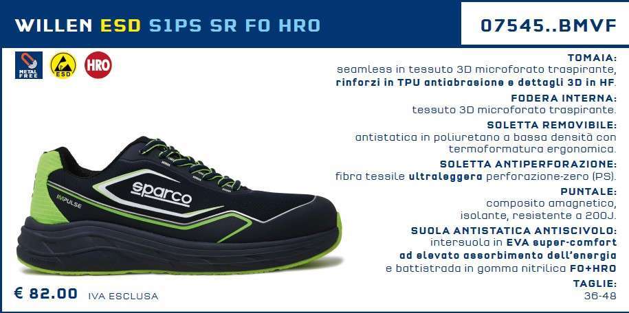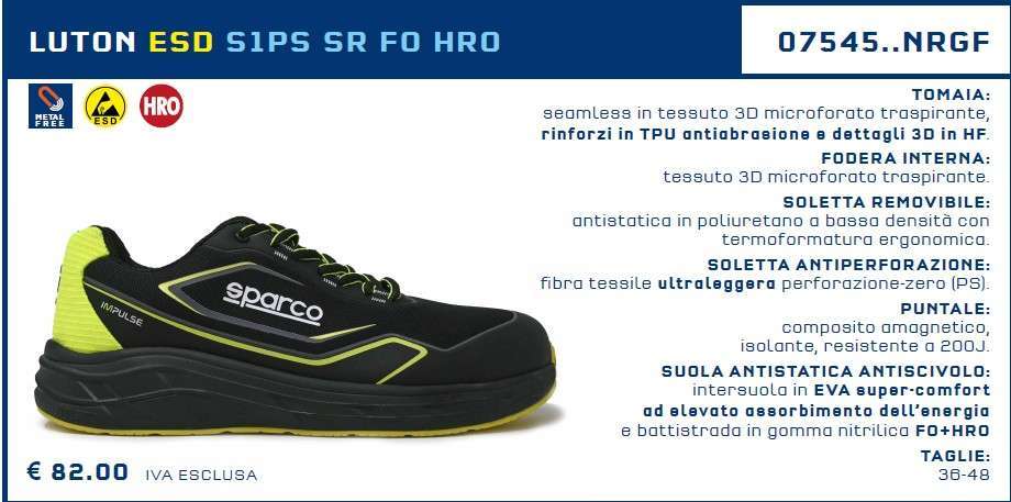 Le Scarpe Antinfortunistica da Lavoro Basse SPARCO IMPULSE ESD S1 SR FO HRO WILLEN e LUTON sono la scelta ideale per chi cerca un prodotto di alta qualitร , durevole e confortevole, senza compromessi sulla sicurezza. Con Sparco, la protezione sul lavoro รจ garantita da un marchio che da sempre รจ all’avanguardia nel campo della sicurezza