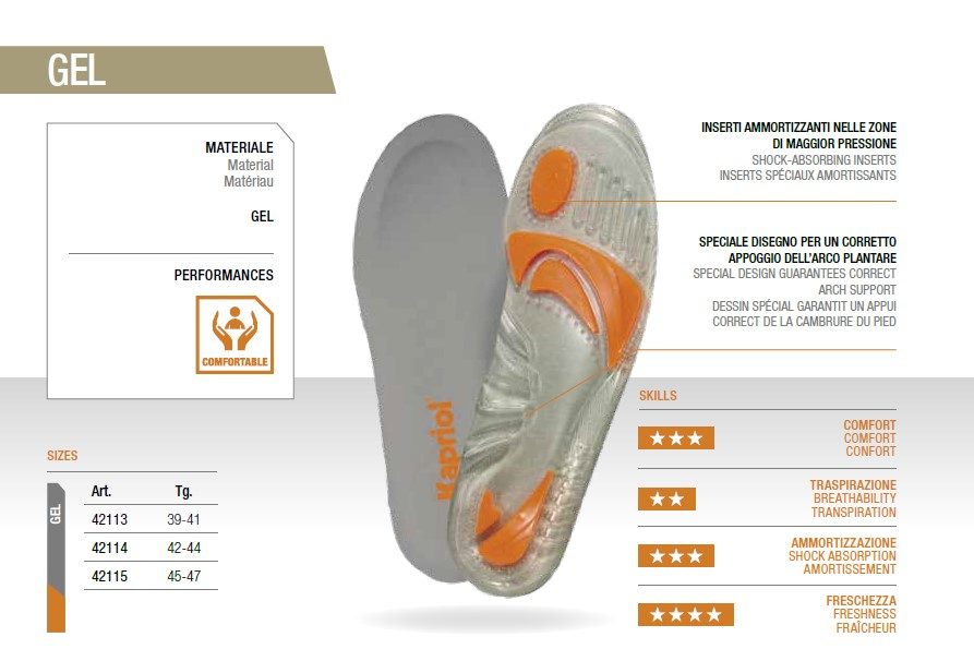 Sottopiede in gel ad effettoย rinfrescante concepito perย dare un sostegno adeguatoย al piede ed un elevatissimoย comfort.