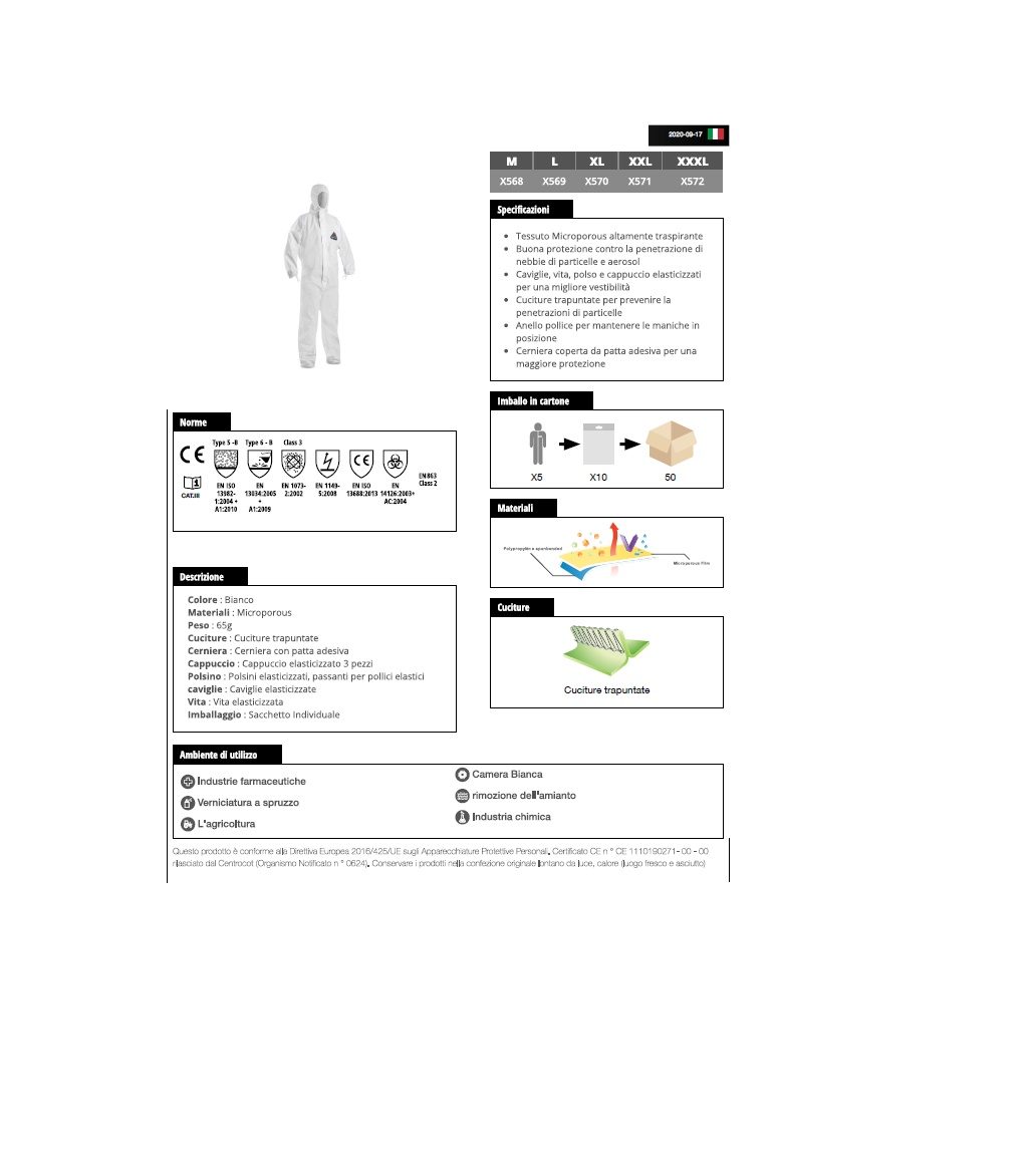 Imballo in cartone:ย 5 tute di protezione /Sacchetto; 10 Sacchetti/Cartone; 50 tute di protezione /Cartone