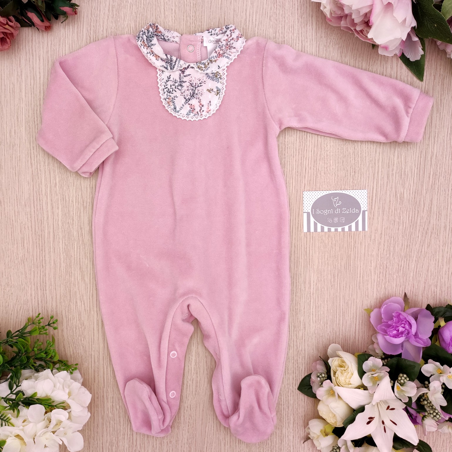 Tutina Deolinda – Rosa Antico Fiorellini, in ciniglia 6 mesi – 80% cotone, 20% poliestere – Made in Portugal cod: DBI21304