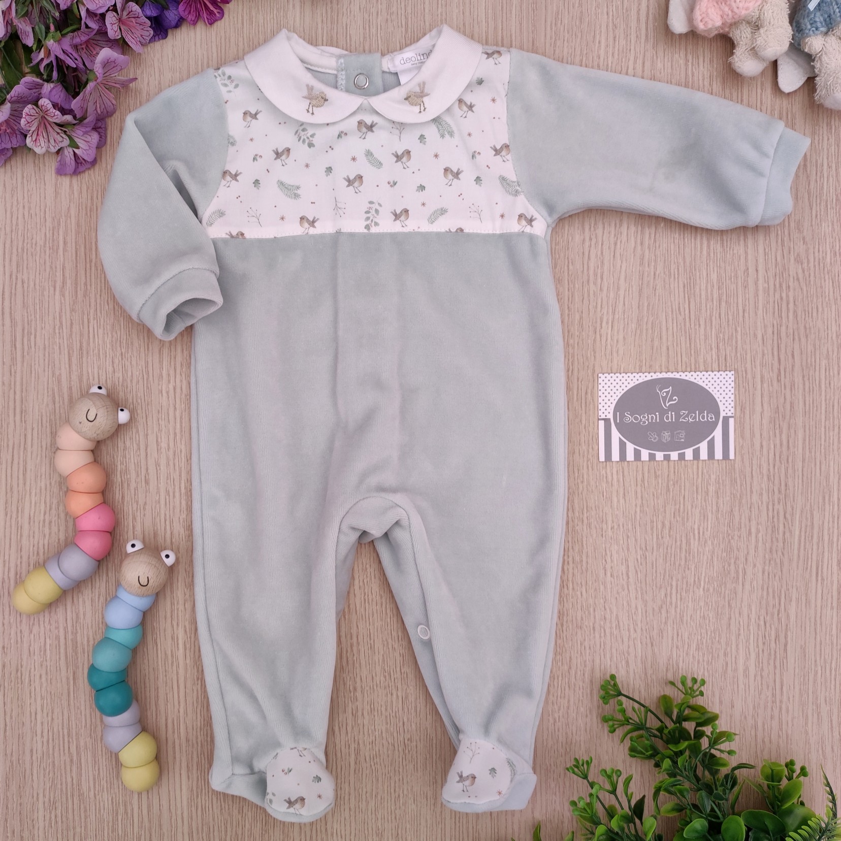 Tutina Deolinda – Verde Uccellini Colletto Ricamato, in ciniglia 0 mesi, 3 mesi – 80% cotone, 20% poliestere – Made in Portugal cod: DBI24112
