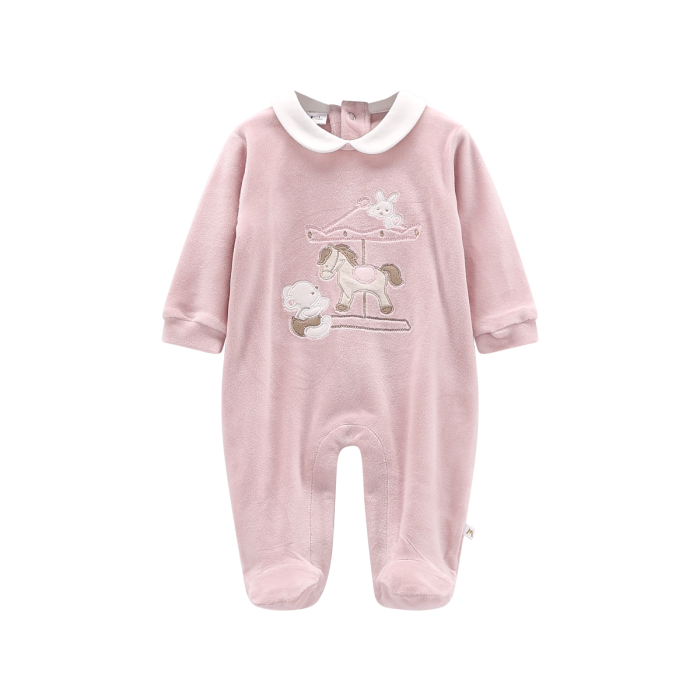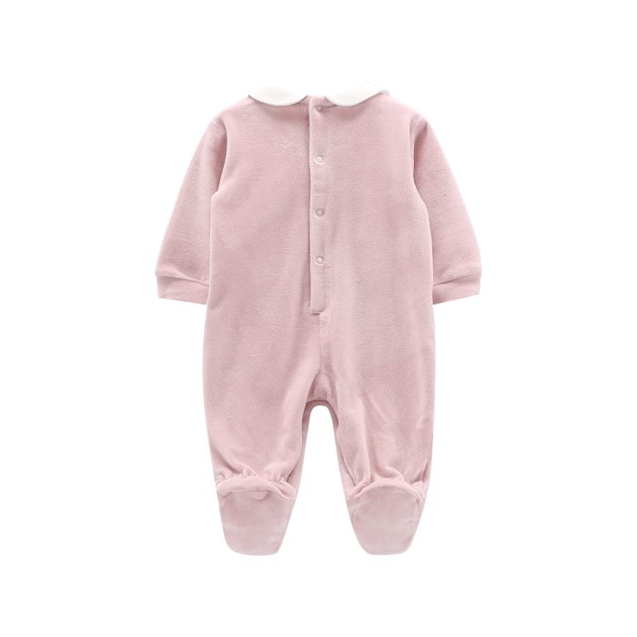 Tutina con piede realizzata in ciniglia soft per neonata. Colletto bebรจ e tenera applicazione sul lato frontale. Apertura sul retro con bottoncini a pressione.