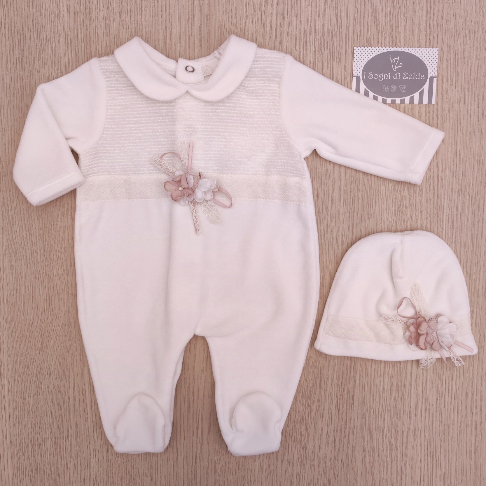 Tutina nascita Ninnaoh – Pizzo Panna in ciniglia con cappellino 1 mese (56cm) – 80% cotone, 20% poliestere – Made in Italy