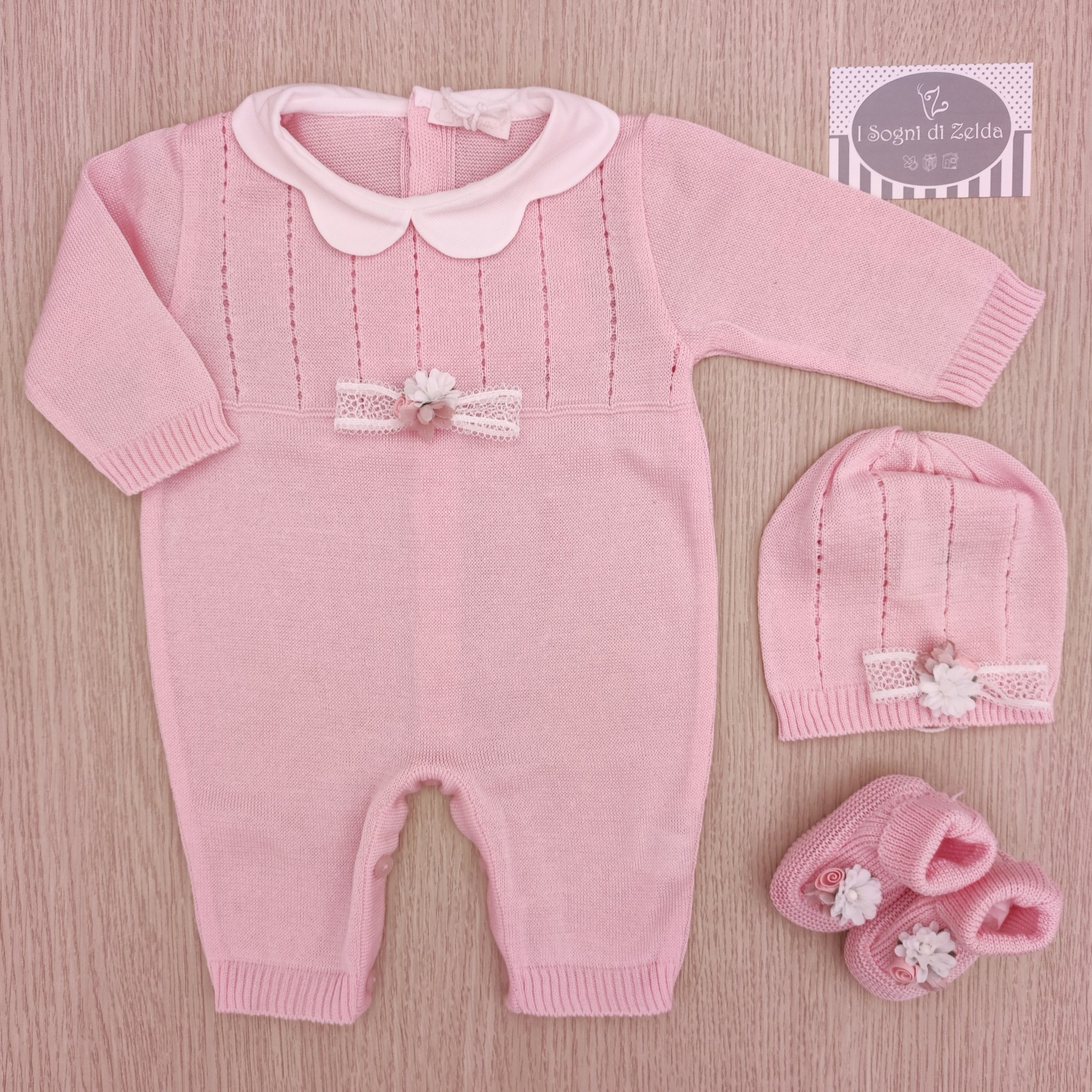 Tutina nascita Ninnaoh – Rosa Fiorellini in filo di cotone – comprende cappellino e scarpette.