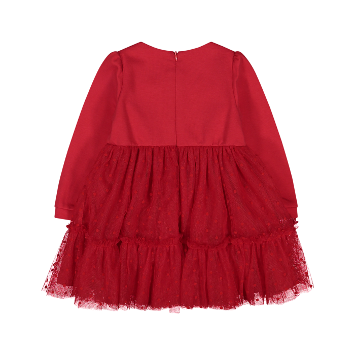 Abito girocollo a maniche lunghe per neonata, realizzato in punto Milano con gonna in tulle a balze e pois tono su tono. Il fiocco applicato in vita e le maniche leggermente a sbuffo danno femminilitร al capo, rendendolo perfetto per le occasioni speciali durante le feste invernali. Pratica apertura sul retro.